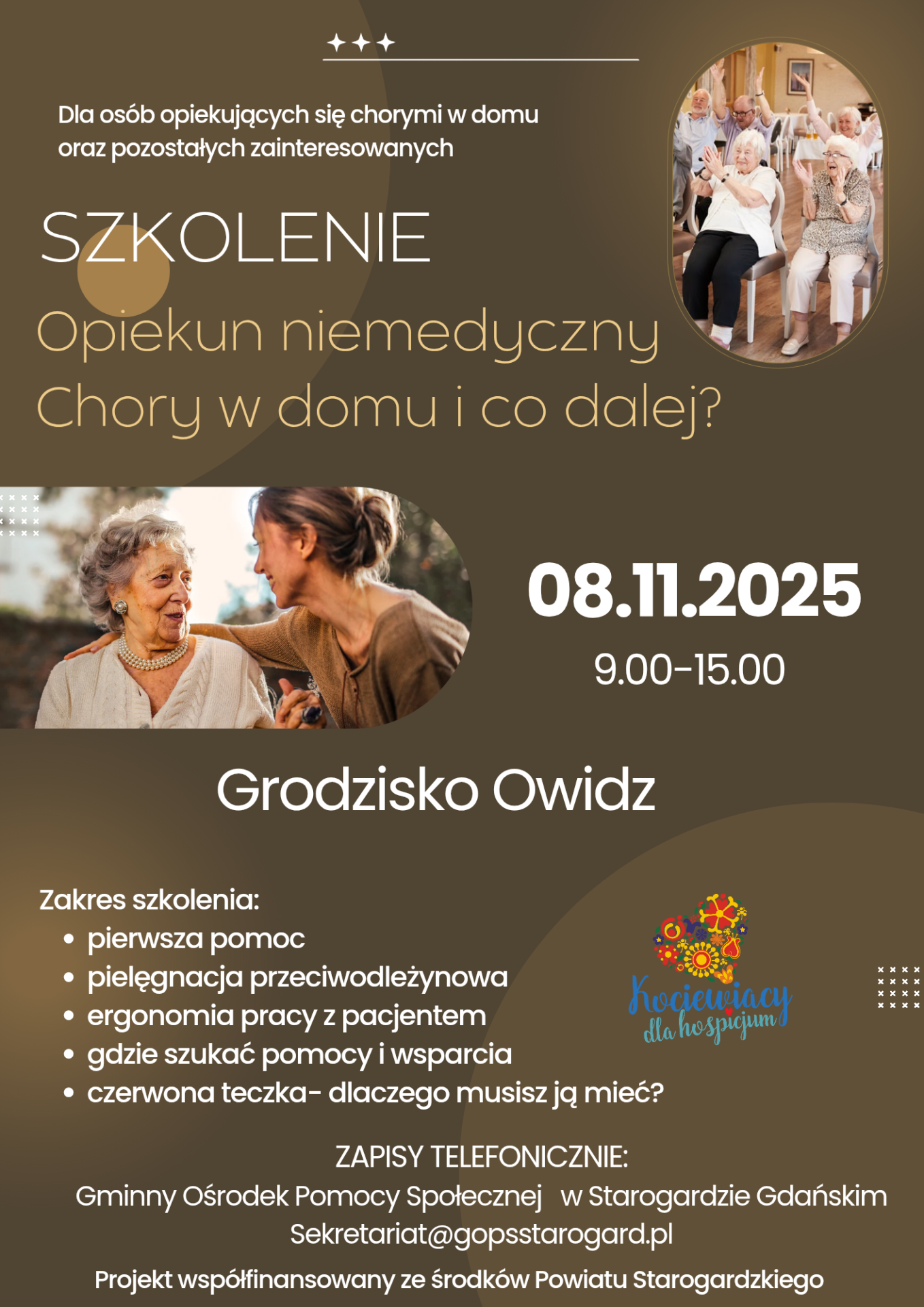 Zapraszamy serdecznie na szkolenie dla niemedycznych opiekunów, każdy kto chciałby poszerzyć wiedzę jak zajmować się chorym, leżącym pacjentem w domu, jest mile widziany na naszym szkoleniu. Będziemy na nim poruszać tematy fizjoterapeutyczny, pierwszej pomocy, pielęgnacji pacjenta, ergonomii ruchu, sprzętu medycznego w domu oraz o czerwonej teczce.